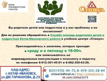 Продолжается работа Службы помощи родителям детей и подростков Катав-Ивановского района в рамках реализации социального проекта, с использованием гранта Президента Российской Федерации, предоставленного Фондом президентских грантов.